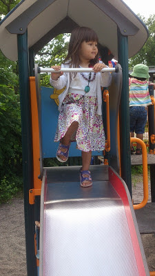 На площадке маме пришлось изобразить динозавра, преследующего Роксану. Эмиль отдыхал в коляске.